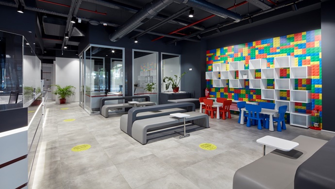 Doktor odası, mekanın ortasında şeffaf bir hacim olarak konumlandırılmış