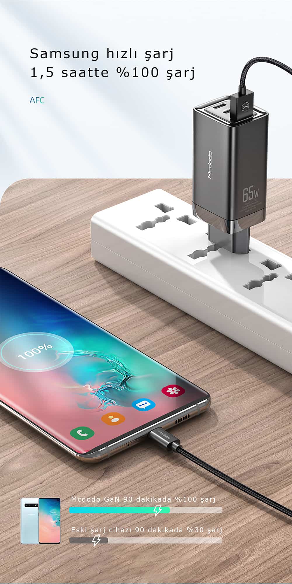 Mcdodo GaN 65W şarj adaptörü Samsung marka bir akıllı telefonu 90 dakikada yüzde 100 şarj edebiliyor. 124 gramlık ağırlığıyla da taşıma kolaylığı sağlıyor. Yine Type-C üzerinden 90 dakika içinde Macbook Pro ve MacBook Air’i hızlı şekilde tam şarj edebiliyor. iPhone hızlı şarjıyla ise 30 dakikada yüzde 50 şarj imkanı sunuyor.