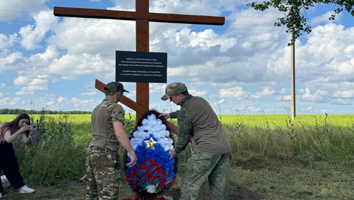Birleşik Rusya gönüllüleri, Kursk sınır bölgesinde hayatını kaybeden askeri sağlık görevlileri için anıt haçı dikti