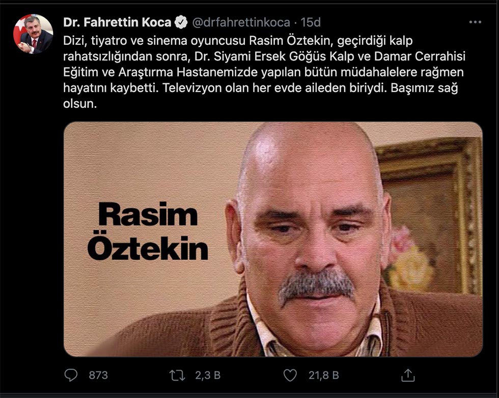 Sağlık Bakanı Fahrettin Koca Twitter’dan şu açıklamayı yaptı: Dizi, tiyatro ve sinema oyuncusu Rasim Öztekin, geçirdiği kalp rahatsızlığından sonra, Dr. Siyami Ersek Göğüs Kalp ve Damar Cerrahisi Eğitim ve Araştırma Hastanemizde yapılan bütün müdahalelere rağmen hayatını kaybetti. Televizyon olan her evde aileden biriydi. Başımız sağ olsun.