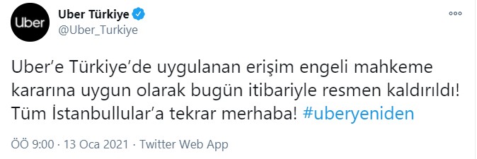 Uber Türkiye’nin Twitter hesabından yapılan açıklamada; “Uber’e Türkiye’de uygulanan erişim engeli mahkeme kararına uygun olarak bugün itibariyle resmen kaldırıldı! Tüm İstanbullulara tekrar merhaba!” denildi.